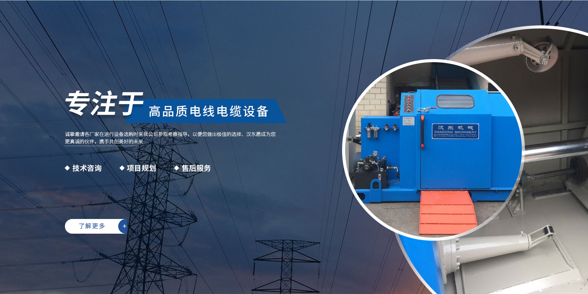 常州漢東機械始創于2006年,是集電線電纜機械設計、開發、制造、安裝、調試為一體化的高科技企業。本公司自開業以來,積極引進日本,歐美等國外電線電纜設備之先進技術,先后成功推出了達到行業先進水平的電線電纜設備,主要產品有擠出、繞包、束線、成纜等電線電纜固定設備。在提供系統設備的同時,還向客戶提供售前技術咨詢、項目規劃、以及售后服務。我公司本著“以人為本、科技先導、用戶為上”的宗旨,為客戶提供牢靠的產品與省心的服務。漢東愿成為您更真誠的伙伴,攜手共創美好的未來! 了解更多+大核心優勢